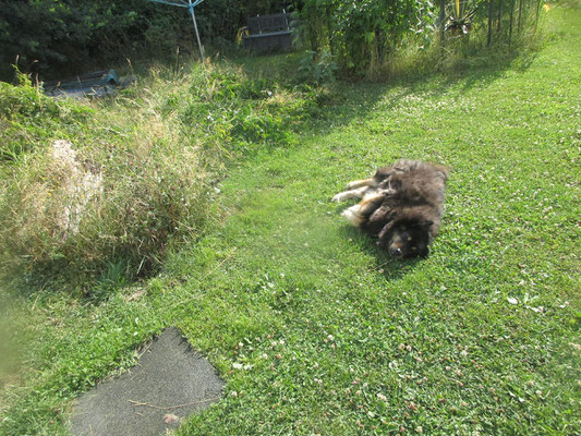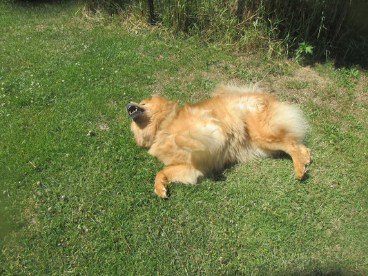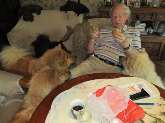 Da Herrchen noch kein richtiges Frühstück hatte, hat er sich ein belegtes Brötchen gekauft,