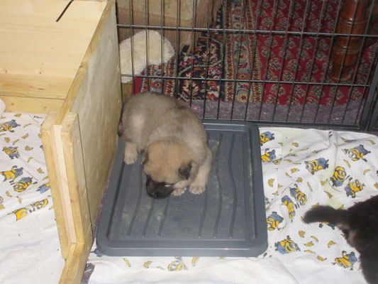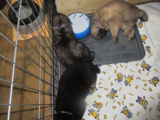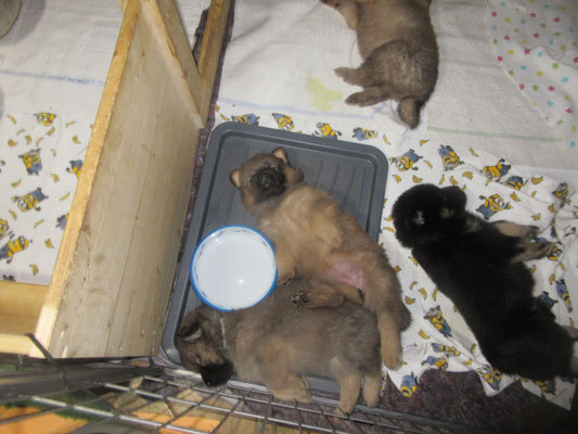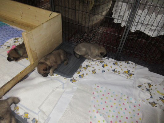 "Hallo, Ihr Halbgeschwister vom C-Wurf! Diese für uns neuartige Schlafgelegenheit kennt ihr ja auch noch!?"